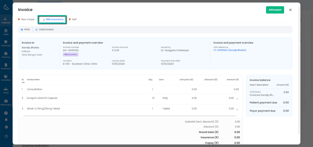 - You have the flexibility to manually switch to a different insurance company or select self invoice option by clicking on “Add payor” button on the top right corner of the invoice.