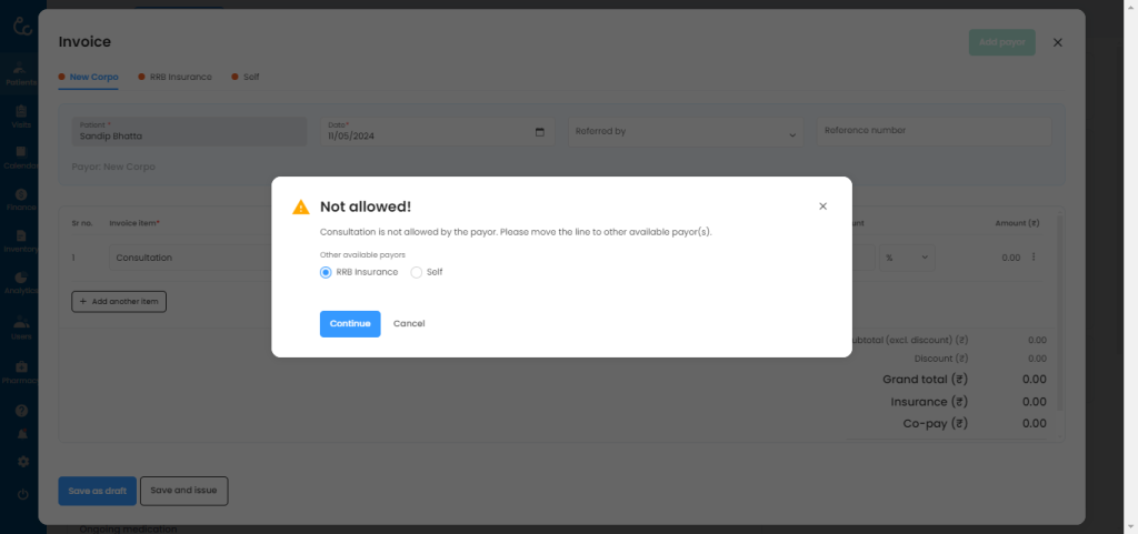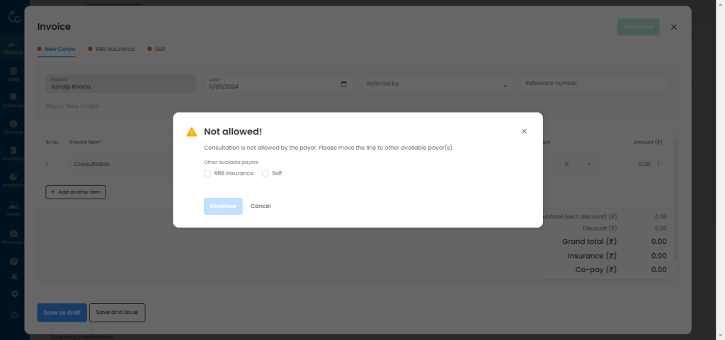- Incase your selected insurance company has some rules or exclusions where a particular product or service is not allowed then our system will prompt you to move that invoice line to a different available insurance company or self invoice.
