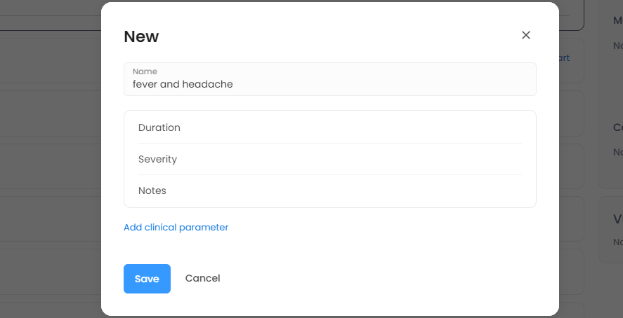 - Once you select any chief complaint, a pop-up will show up with the clinical parameters which is needed to record against the chief complaints.
