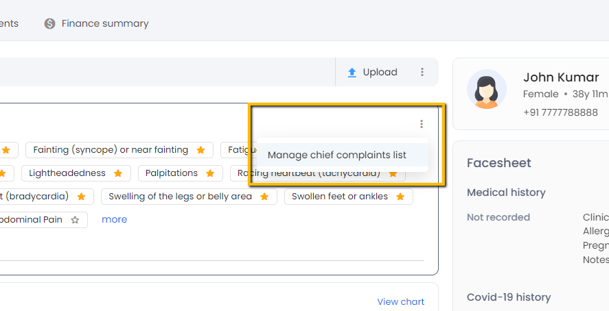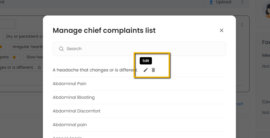- You can edit the name of any chief complaint by going to the context menu on the top right corner of the component-> click on edit icon->update the name.