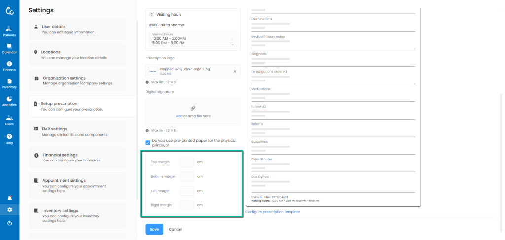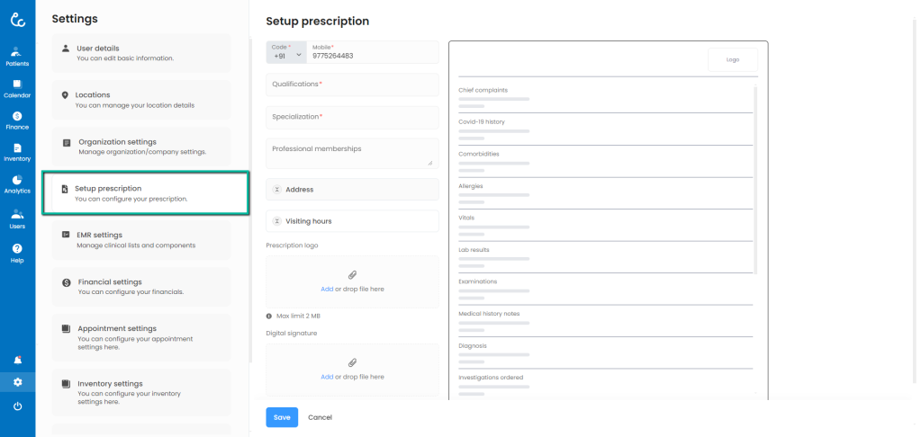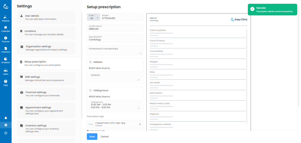 - Fill up details like specialisations, qualifications, clinic address and visiting hours.
