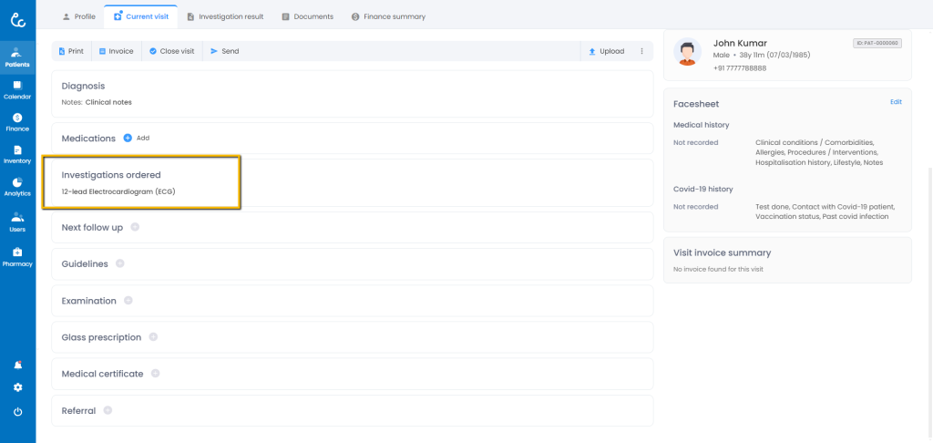 - Once you select any investigations , it will show up in the section.