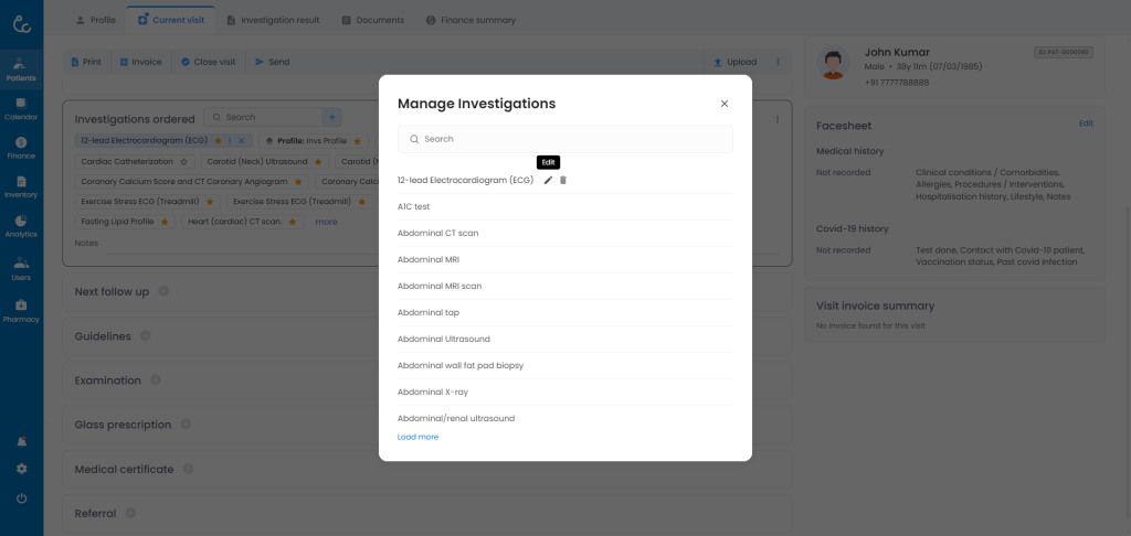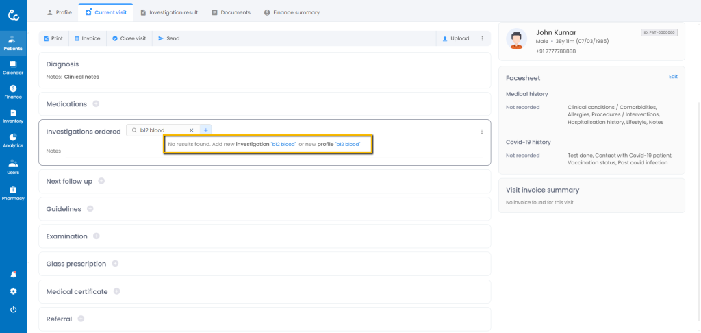- You can find investigations section in the EMR on the left hand side. Click on “+” icon or simply click any where inside the investigations component to expand the section.